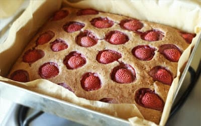 3. Форму для выпечки выстелить пекарской бумагой и выложить в нее тесто. Разровнять, а поверх выложить клубнику, немного утопив ее. Выпекать пирог в течение 50 минут в предварительно разогретой духовку при 180 градусах.